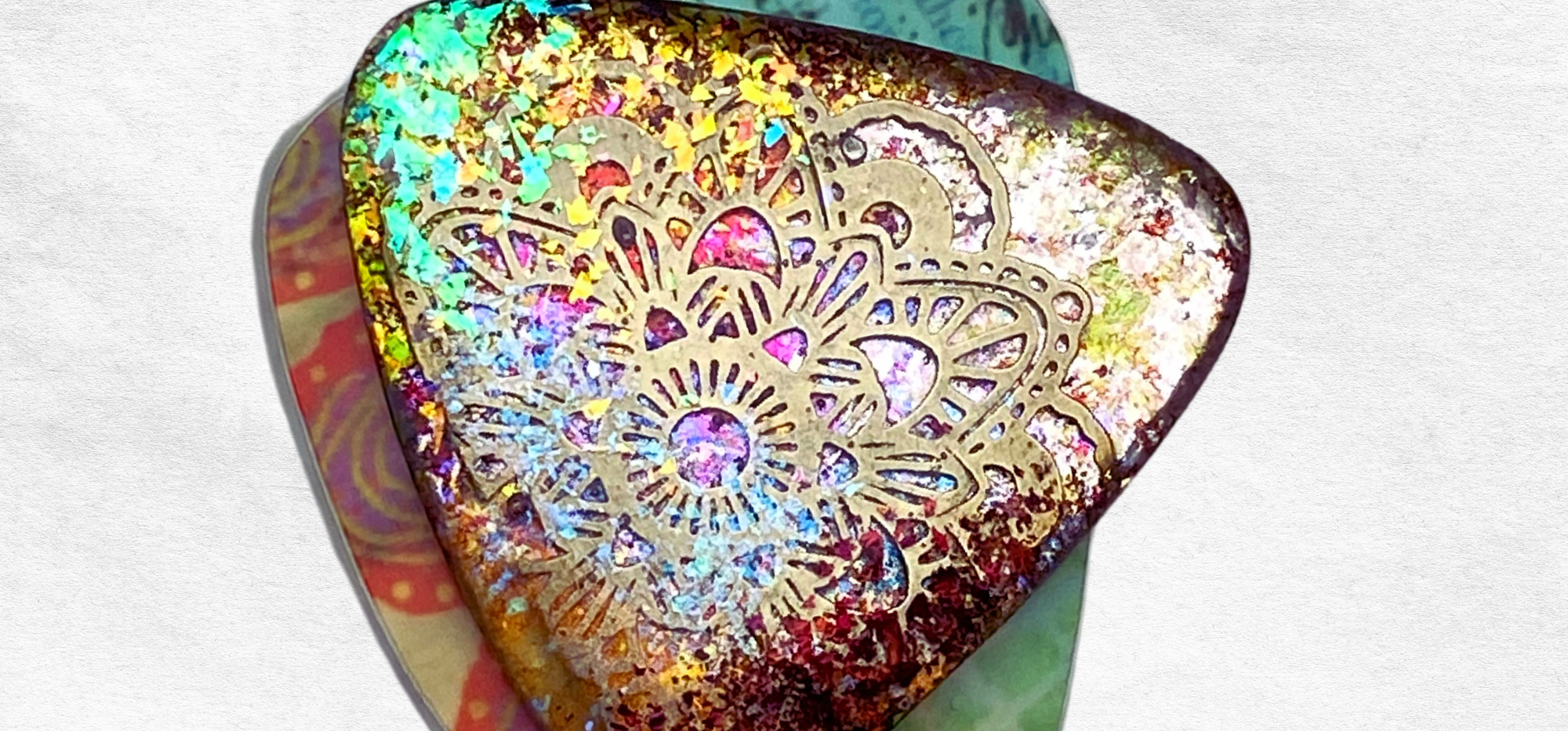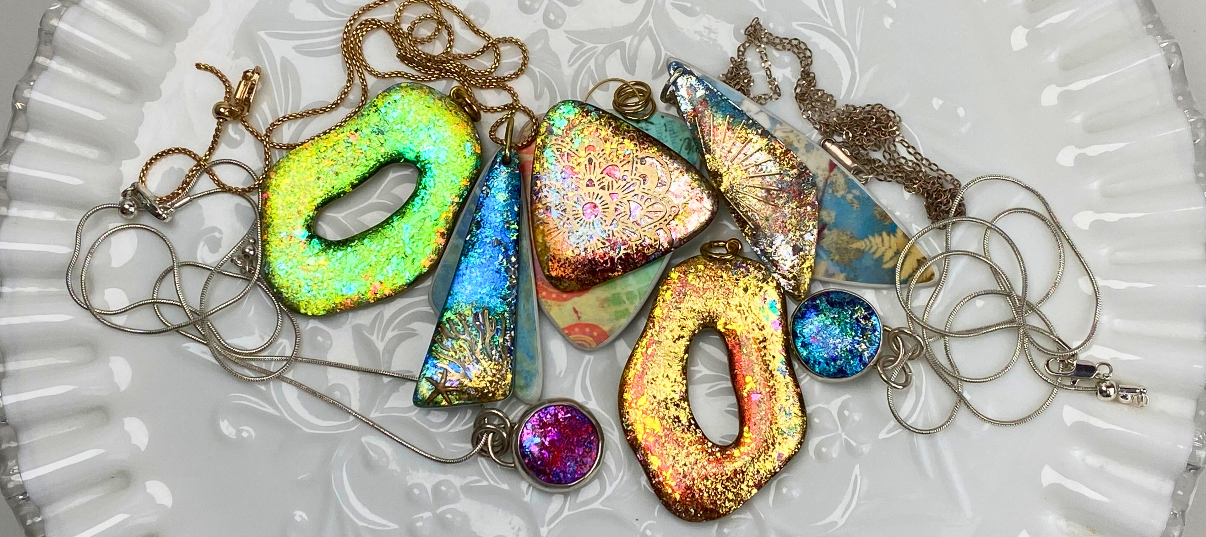 Hi, I'm Shelley Nordman and I am very glad to meet you. It is my joy to create whimsical jewelry to amuse and delight. My favorite stage of the creative process is to explore “What would happen if…?”. This exploration has led me to create jewelry using an ever-changing set of materials and techniques. Currently I love using multi chrome powders and flakes, layered within resin. I often incorporate images using dye sublimation transfer, stencils, and stamping and create unique sterling silver settings and components.