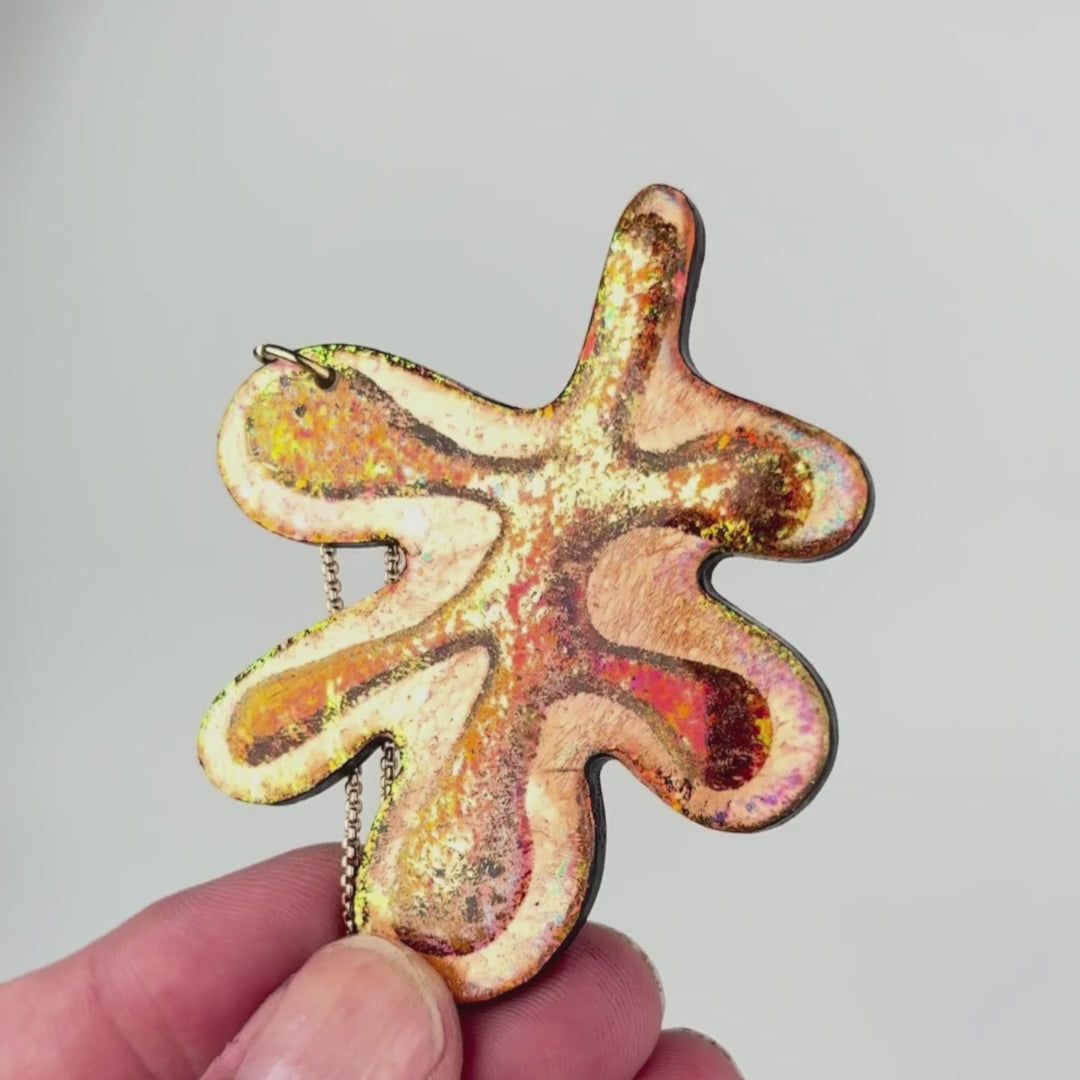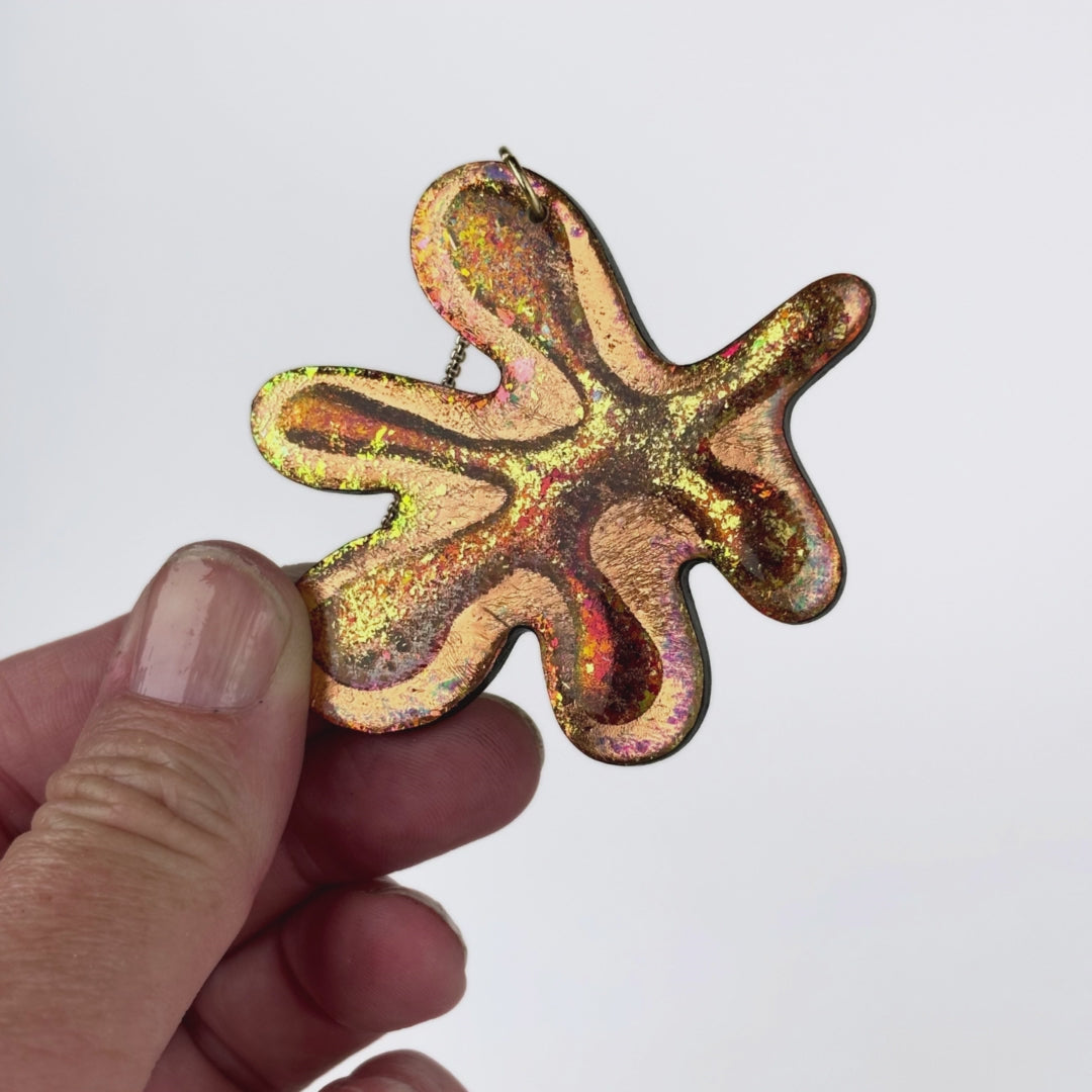 This dazzling pendant looks like it glows when the light hits it. You won't believe it until you see it with your own eyes. The piece is very sparkly and rich. The necklace features a "Shelley-Created-Gem" in the shape of an abstract falling leaf with a mid-century modern vibe. Use a damp, soft cloth to clean. Each item is handmade so there will be variations from the pendant pictured.