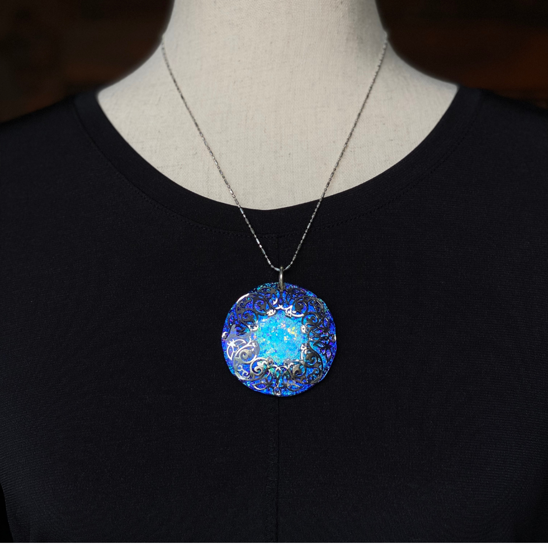 Materials: FRP, foil, multi-chrome flakes, resin, and a silver-plated chain.