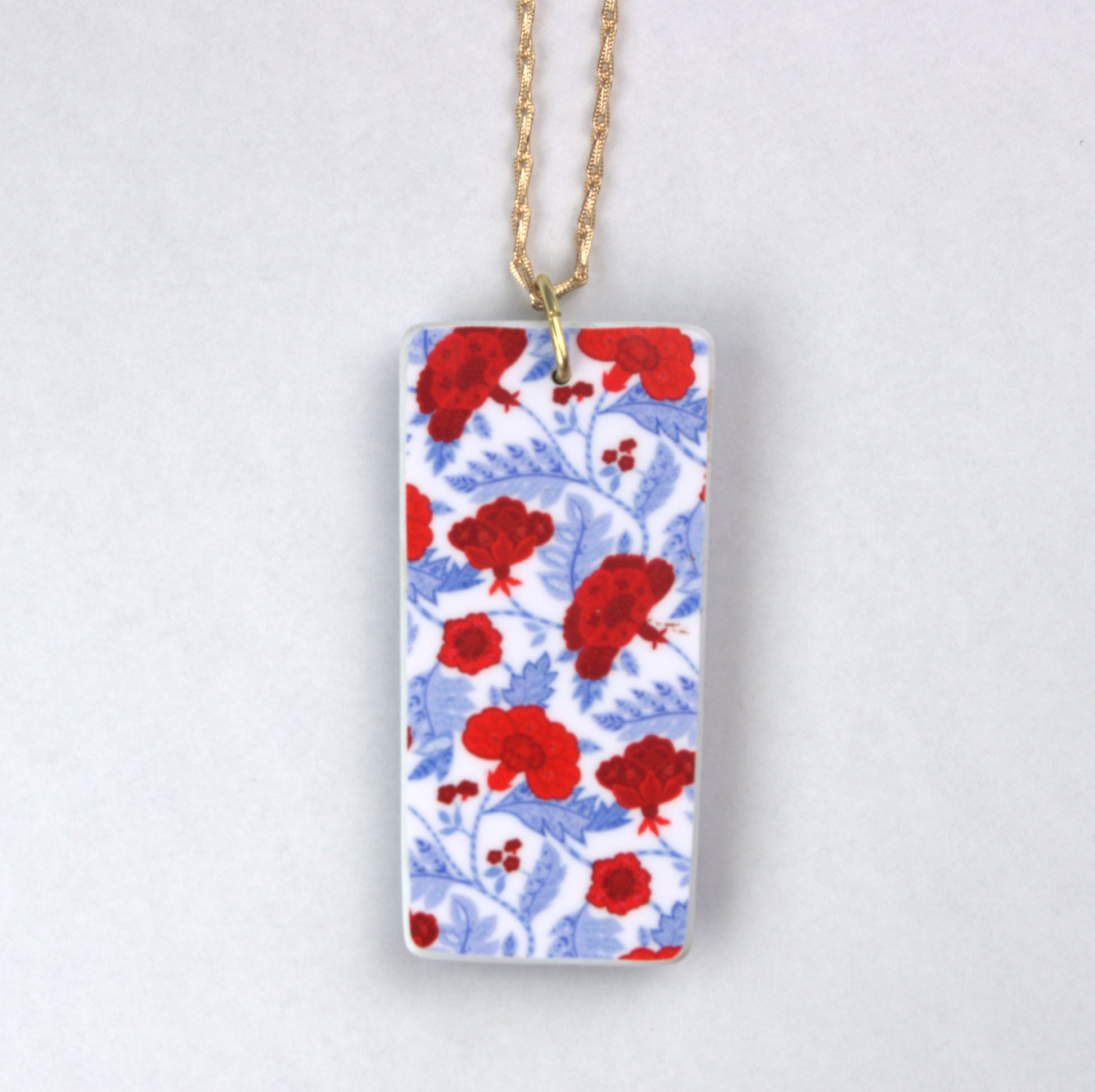Red, white, and blue, but no stars or stripes in sight. These colors and patterns dance together on this layered necklace. The first layer is highlighted with a dome of resin and a blue-on-blue damask is on the back layer. Coordinating prints liven up the back of the pendant so you don't have to worry about it accidentally flipping over. The necklace is made of FRP, resin, and gold-plated chain. FRP is very strong and lightweight. Use a damp, soft cloth to clean. Each item is handmade so there will be slight variations from the necklace pictured.