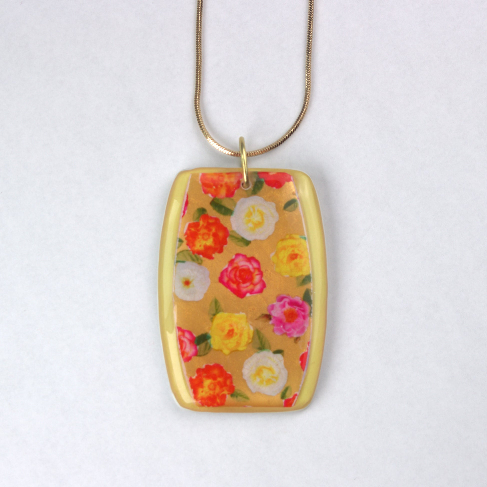 Orange, pink, white, and yellow roses are scattered across a gold background on the front of this pendant. Tip it just right to see the gold really shine. The reverse is gentle solid yellow. Use a damp, soft cloth to clean. Each item is handmade so there will be slight variations from the necklace pictured.