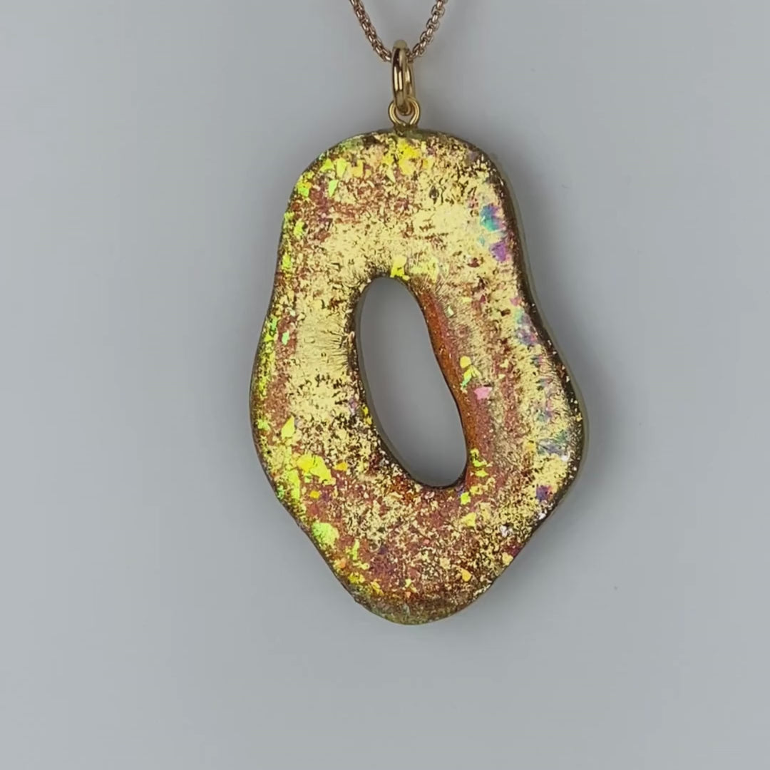 Materials: FRP, foil, multi-chrome flakes, resin, and a gold-plated chain.