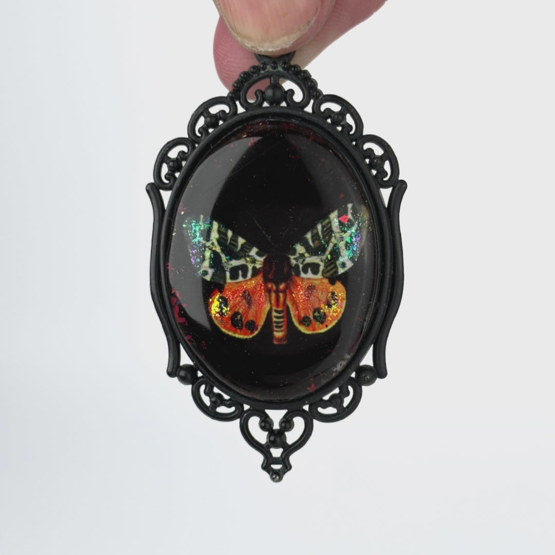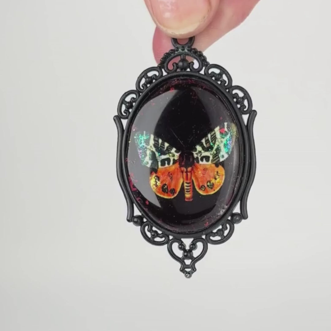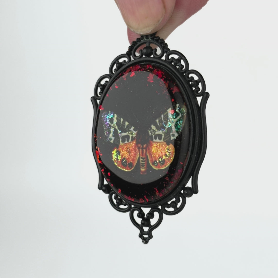 Taken from a vintage scientific illustration, this butterfly is brought to life with color-shifting glitter. The colors change right before your eyes as you tilt the pendant. Magic? Maybe. Mesmerizing? Definitely. Use a damp, soft cloth to clean. Each item is handmade so there will be variations from the pendant pictured.