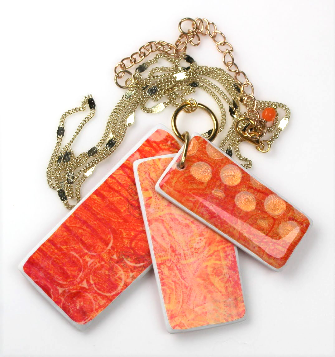 Three layers of orange juicy goodness. The designs are on the front and back of each layer so you don't have to worry about it accidentally flipping over. Use a damp, soft cloth to clean. Each item is handmade so there will be slight variations from the necklace pictured.