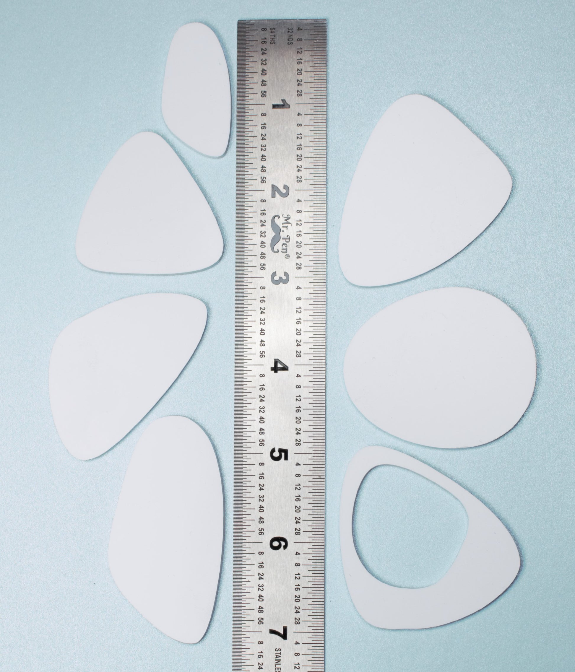 Dye Sublimation Blank Shapes are made of Unisub FRP (Fiber Reinforced Plastic), sublimatable on both sides, matte finish (Matte according to Unisub, but I think the finish is more of a lovely low sheen.) I cut each shape here at Orange Poppy Studio. This material can be cut with a jeweler's saw. You will also receive a paper template of each shape. I find templates to be extremely useful in positioning the blank shape on the sublimation print. See the Quick Start Tutorial on YouTube at the Shelley Nordman-Orange Poppy Studio Channel.